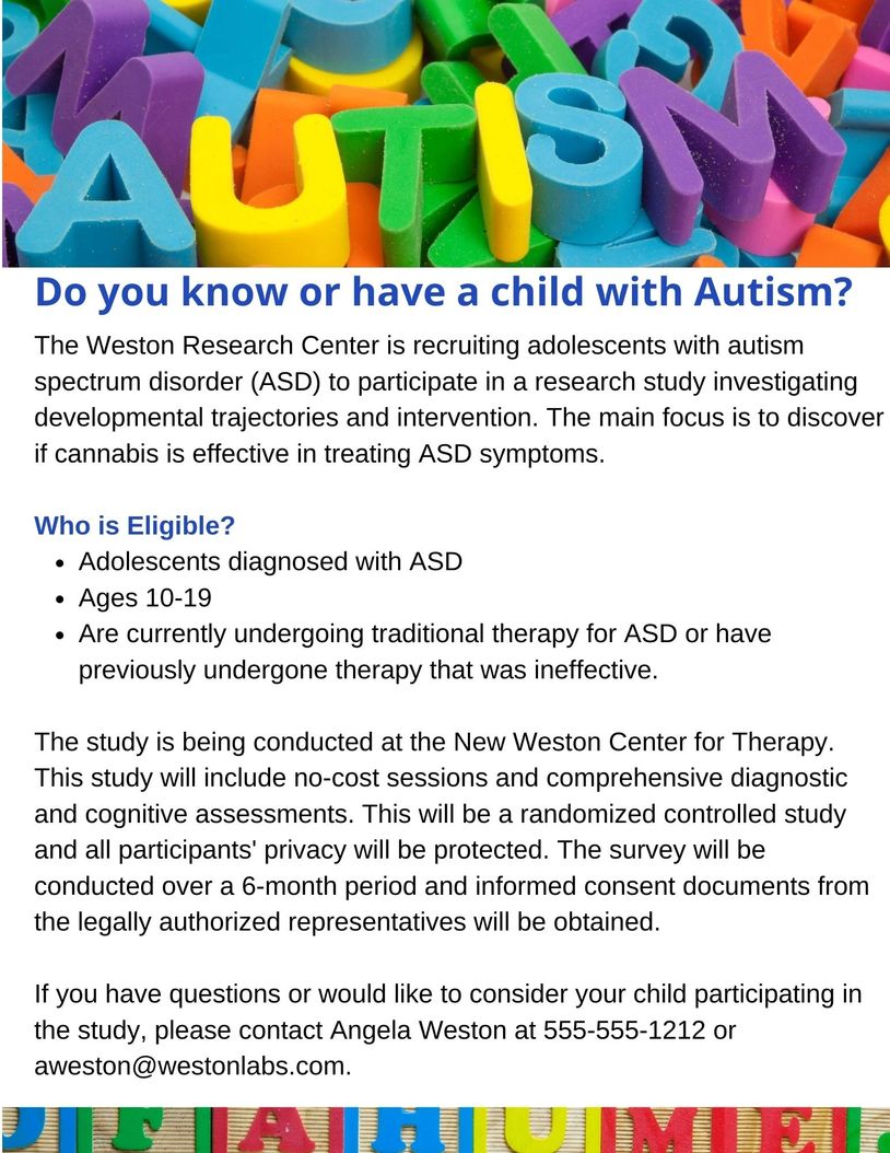 Create a flyer or infographic to be posted to the general public for recruitment into your cannabis clinical research study. Communicate key ethical practice information to potential study subjects including distinction of vulnerable participants, privacy protection, the informed consent process, and other pertinent issues specific to your study design.